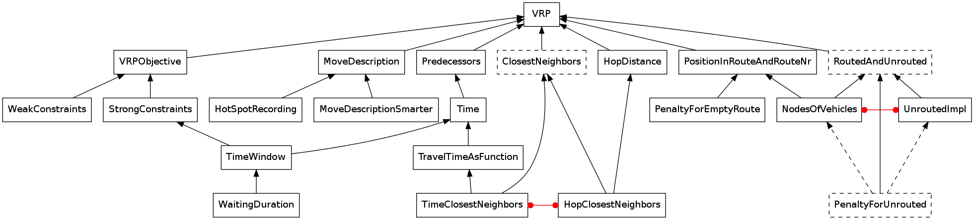 Our modeling approach for relies on the mechanism of traits of the Scala programming language \citescala which supports partial implementation of interfaces. A scala class can also inherit from multiple traits. We have developed a library of traits, each of them includes an aspect of routing problem (e.g. nodes predecessors, time), bundling the necessary variables, invariants, and constraints. Any combination of routing problem features can be represented by assembling them on top of a base routing class. Our library is integrated in the CBLS engine of the OscaR open source optimisation framework.