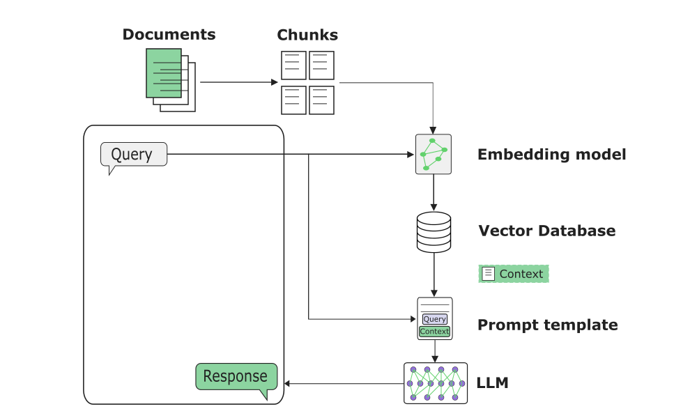 Next comes the augmented generation phase (generation step), where the system combines relevant text fragments with the user’s question. This step creates an "enriched prompt" containing both the question and this additional information. Finally, the model generates a response by drawing on two sources of knowledge: the specific information provided in the context (the retrieved text fragments) and its general knowledge acquired during its training phase.