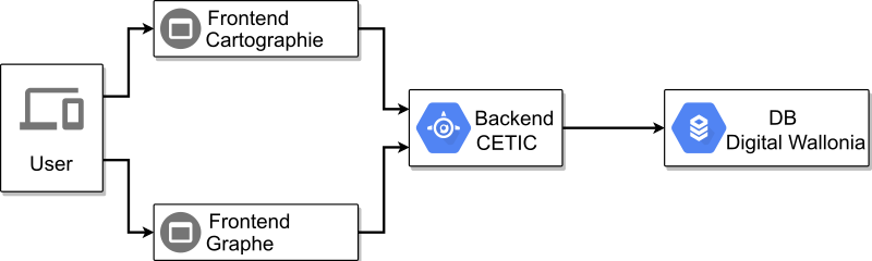 Le "backend" fournit des résultats préformatés à partir des données brutes de Digital Wallonia de façon à ce que les cartes soient le plus facile possible à intégrer au sein de pages web. Développé en Python sur base de Flask, ce code est déployé sur une infrastructure Openshift.