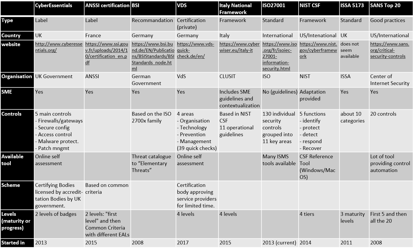 On peut citer dans cette catégorie ISO27001 ou encore ISSA5173 (UK) qui ont tenté de s’adapter aux PME mais avec un succès très limité.