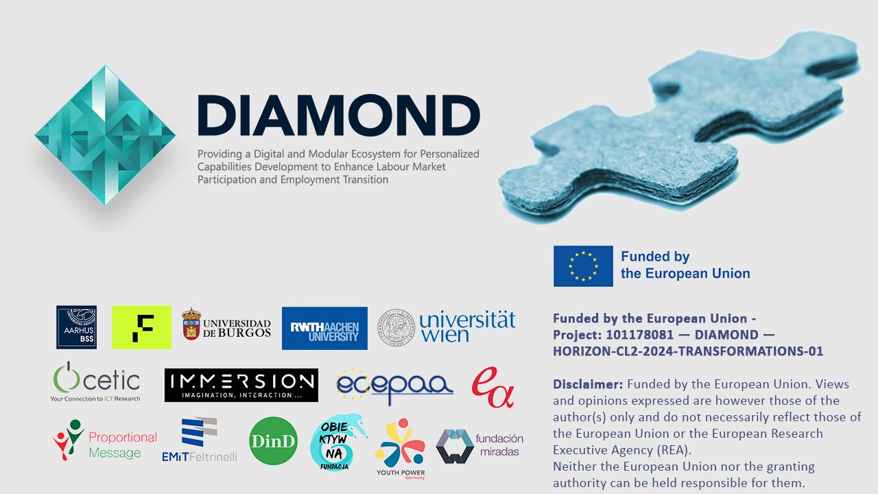 Le projet DIAMOND vise à soutenir les personnes issues de milieux socio-économiques vulnérables dans leur parcours vers l’emploi en personnalisant les programmes de formation et en renforçant leur employabilité. Pour atteindre cet objectif, DIAMOND développe deux solutions innovantes : l’Indice de Croissance de l’Employabilité (EGROW Index), qui permet de mesurer et d’adapter les compétences des individus, et la Plateforme MOVE, une solution numérique dédiée à l’apprentissage tout au long de la vie avec des micro-certifications personnalisées.