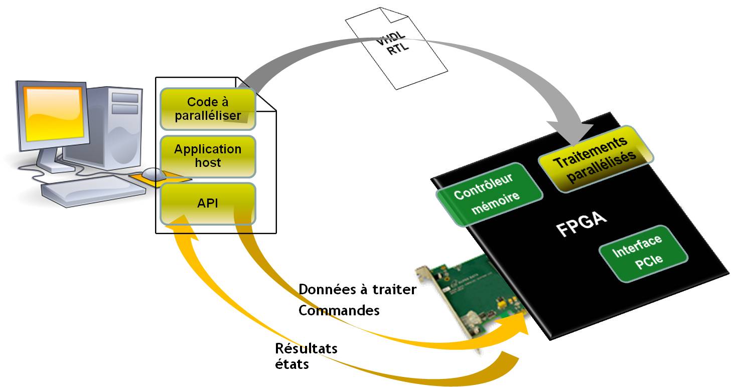 Le CETIC étudie l’optimisation d’algorithmes, issus d’applications logicielles industrielles, par accélération sur une carte intégrant un FPGA haute densité, un espace mémoire DDR3 et l’interface PCIe. Dans le cadre du projet de recherche appliquée PSOPP par exemple, l’exécution de fonctions critiques du logiciel initial, consommatrices de temps, est déportée du CPU vers le FPGA après migration du code d’origine en langage VHDL. Les traitements, ainsi parallélisés, sont intégrés dans le FPGA ainsi que les fonctions d’accès à la mémoire et l’interface PCIe de la carte.