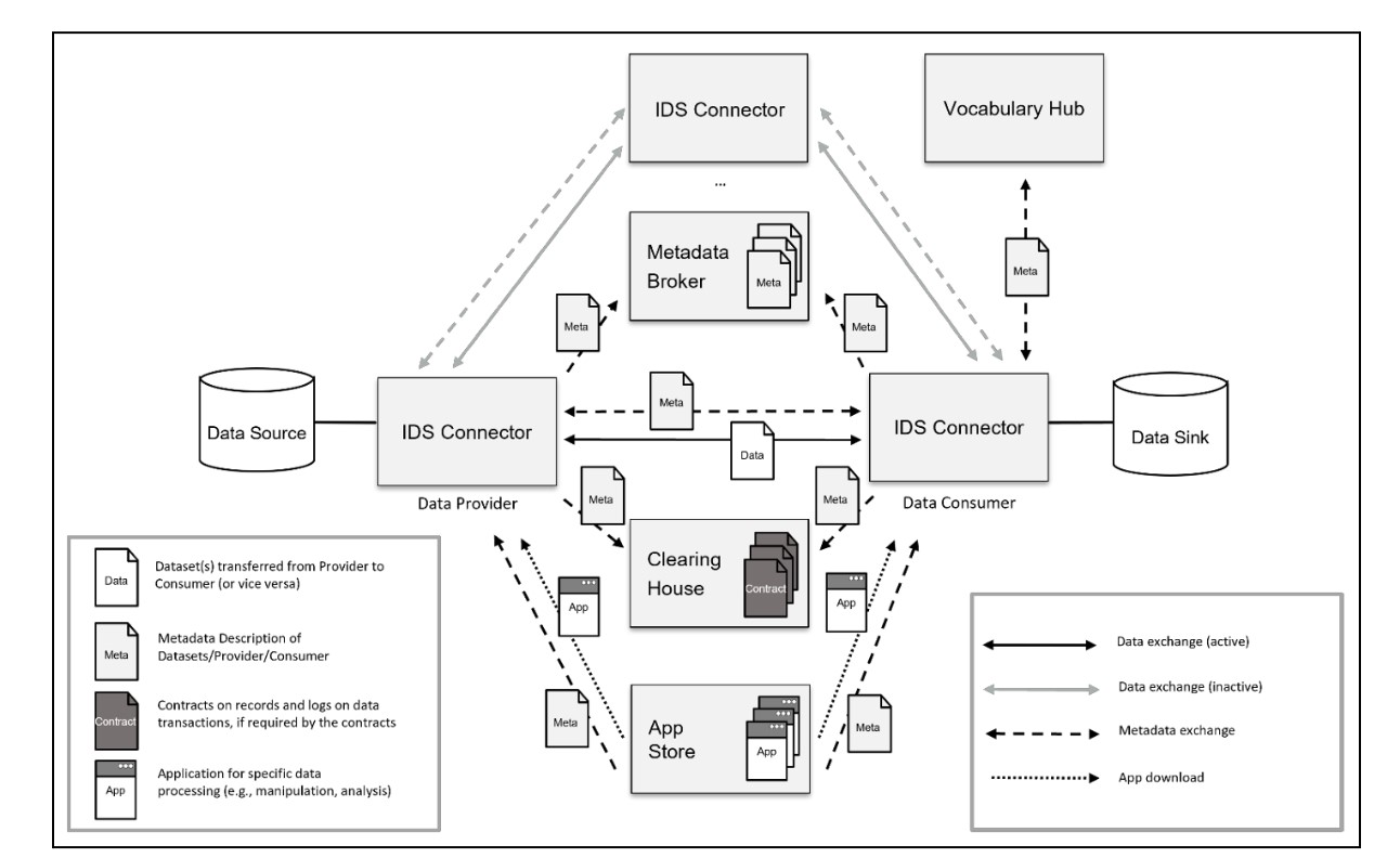 In addition to Connectors, key IDS components include the Identity Provider for authentication, the Metadata Broker for catalog management, the Clearing House for transaction logging, and the App Store for extended data services. Figure 1 illustrates the interactions among these components.
