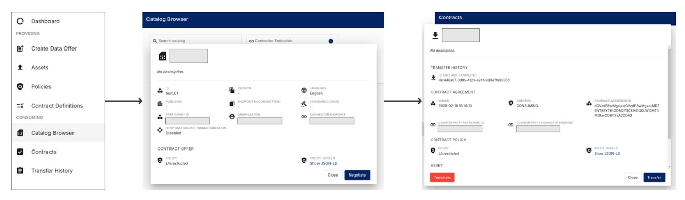 Transfer data : the consumer can request the data transfer. This is done by clicking a button in the contract’s detailed view in their connector UI. The consumer is prompted to provide details about the data sink, including the endpoint parameters. Once these details are provided, the employee clicks a button to initiate the transfer.
