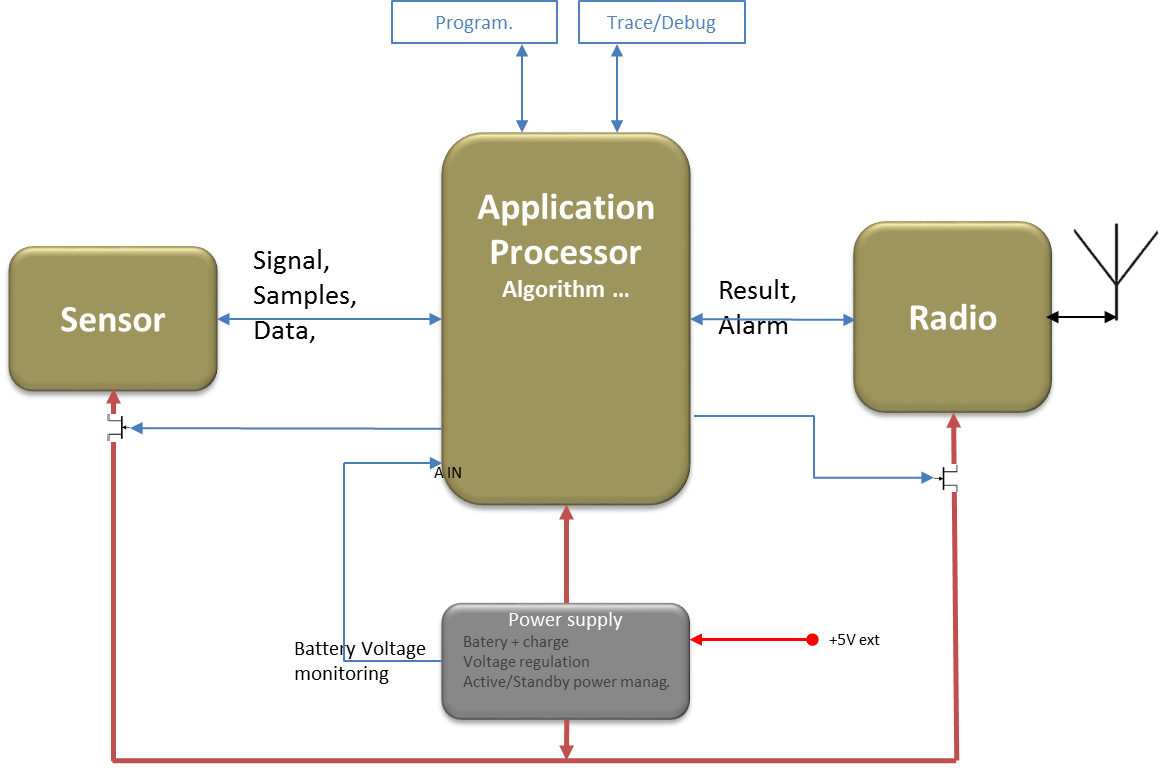Comme pour la programmation d’une machine d’état, l’analyse des différentes phases de fonctionnement permet de définir précisément les actions et les changement d’états, et ainsi de prévoir les ressources nécessaires avec leur consommation. Cela inclut en plus des ressources fonctionnelles (capteur, récepteur GPS, transceiver radio…) d’autres plutôt secondaires (surveillance de la tension d’alimentation, contrôle des alimentations …) ainsi que celles requises pour les changements d’états.