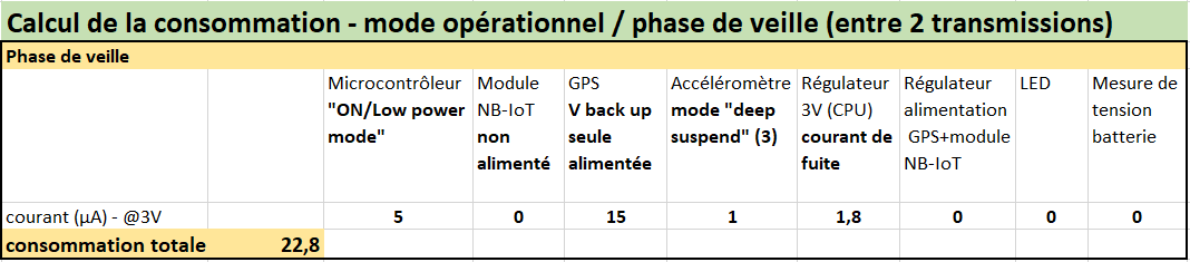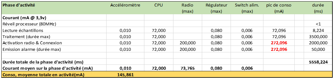 L’évaluation de la consommation électrique est basée sur les informations de la documentation technique des composants. Les valeurs de courants fournies par les constructeurs résultent de mesures effectuées dans des conditions précises de fonctionnement. Même si la mise en œuvre matérielle du système respecte les plages de fonctionnement nominal des composants, de nombreux facteurs tels que la fréquence de travail du processeur, la puissance d’émission radio, tension d’alimentation, influencent la consommation réelle. Le résultat est donc une valeur approchée de la consommation. Cependant l’effet sur l’autonomie globale reste limité, comme expliqué ci-après.