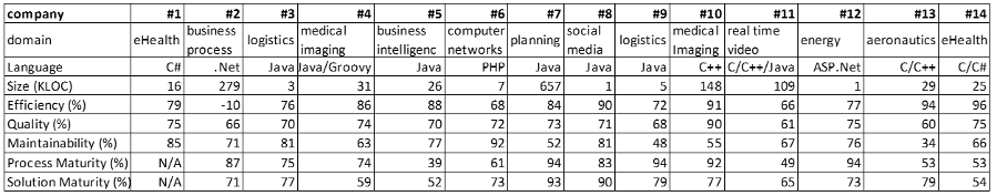 Nous avons appliqué l’approche décrite ci-dessus sur un échantillon de 14 start-ups wallonnes actives dans des domaines variés allant de la Logistique à l’eSanté, et en passant par l’Énergie. La durée typique du sondage est de 5 jours comprenant le contact, l’interview d’évaluation des processus, la collecte du code source et son analyse, la rédaction du rapport (y compris les recommandations), ainsi que le débriefing final avec un plan d’action.