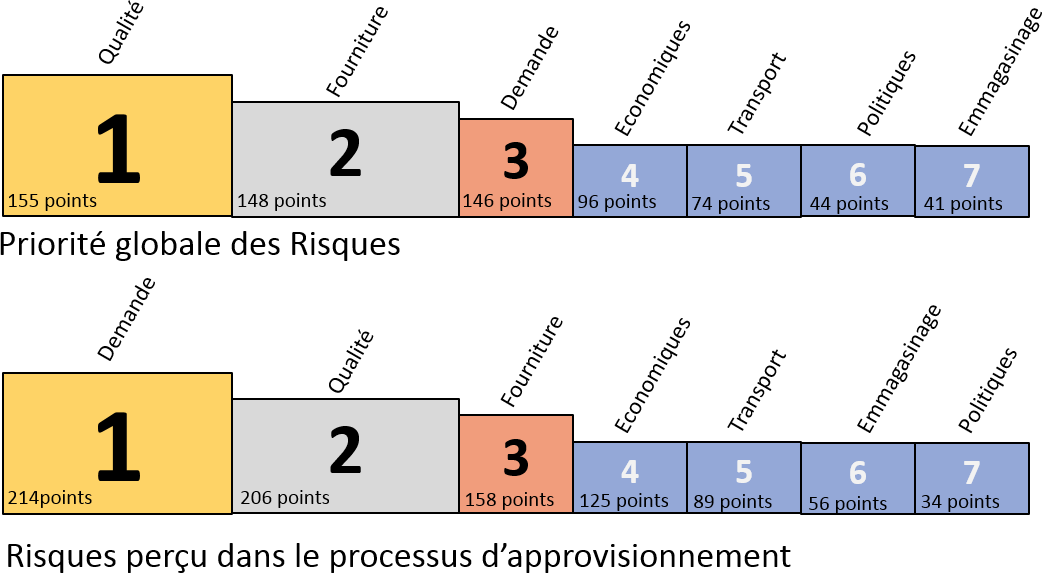 Au niveau des risques les plus prioritaires à gérer au niveau du processus de manufacture global (haut de la figure 3), les entreprises ont établi leur top 3 sur les risques de qualité (produits ne rencontrant pas les exigences de qualité du cahier des charges), suivi des risques de fourniture (contraintes liées au volume et aux délais exigés par le client) et enfin les risques liés à la demande (directement lié à l’approvisionnement). En considérant plus spécifiquement le point de vue des processus d’approvisionnement (c’est-à-dire, en amont de la fabrication) le bas de la figure 3 montre un top 3 similaire pour les risques mais avec en premier et de manière assez logique, les risques liés à l’approvisionnement. Les autres risques intervenant dans une moindre mesure sont les risques économiques (ex. faillite d’un fournisseur), politiques (liés à la situation politique d’un pays ou d’une région), de transport (possibilité de perte ou de délai dans l’acheminement) ou d’emmagasinage (perte ou dégradation lors du stockage).