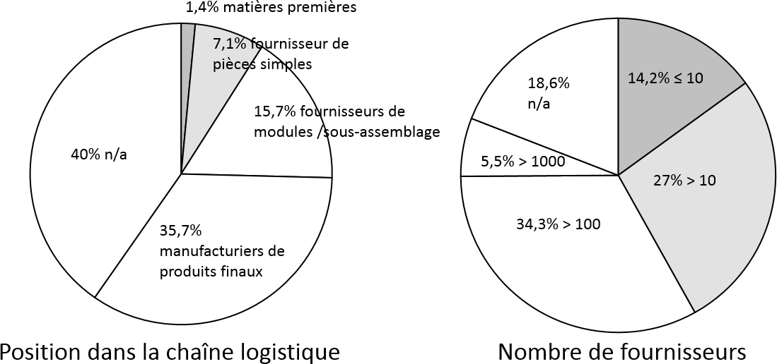 Les entreprises ayant répondu à l’enquête étaient en majorité des manufacturières de produits finaux, mais un nombre significatif d’assembleurs étaient également présents et, dans une moindre mesure, des fournisseurs de pièces (voir figure 2). Par rapport au nombre de fournisseurs de chaque entreprise, on constate un nombre plutôt élevé de fournisseurs en moyenne, il y a en effet autant d’entreprises ayant moins de 100 fournisseurs que d’entreprises ayant plus de 100 fournisseurs. Ce nombre est révélateur du besoin d’avoir des méthodes et des outils capables de gérer une base de fournisseurs importante.