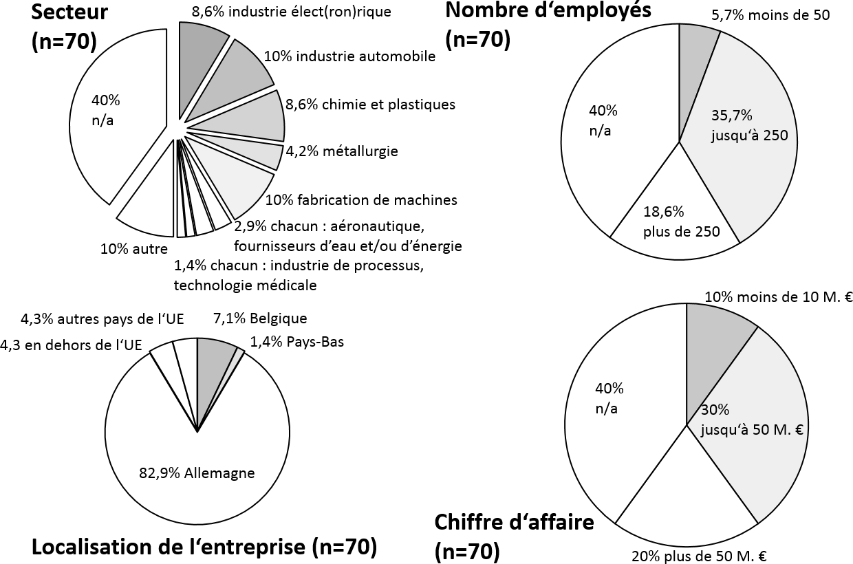 L’enquête a été menée d’octobre 2014 à fin janvier 2015 via un formulaire trilingue (français, allemand, anglais) diffusé via divers canaux en Wallonie et en Allemagne. Environ 70 entreprises ont répondu à l’enquête qui était anonyme par défaut mais permettait aussi d’enregistrer les données de contact des entreprises intéressées à suivre le projet. La répartition des entreprises est équilibrée entre la Belgique et l’Allemagne (étant données les tailles respectives des secteurs dans ces pays). Une grande variété de secteurs industriels manufacturiers a été couverte, sans prédominance marquante d’un secteur. La majorité des entreprises est de taille moyenne (entre 50 et 250 employés). Les entreprises wallonnes sont de plus petite taille, ce qui correspond bien à leur tissu économique. Notons cependant que le secteur manufacturier wallon comporte plus d’entreprises de taille moyenne que les autres secteurs industriels (UWE11)