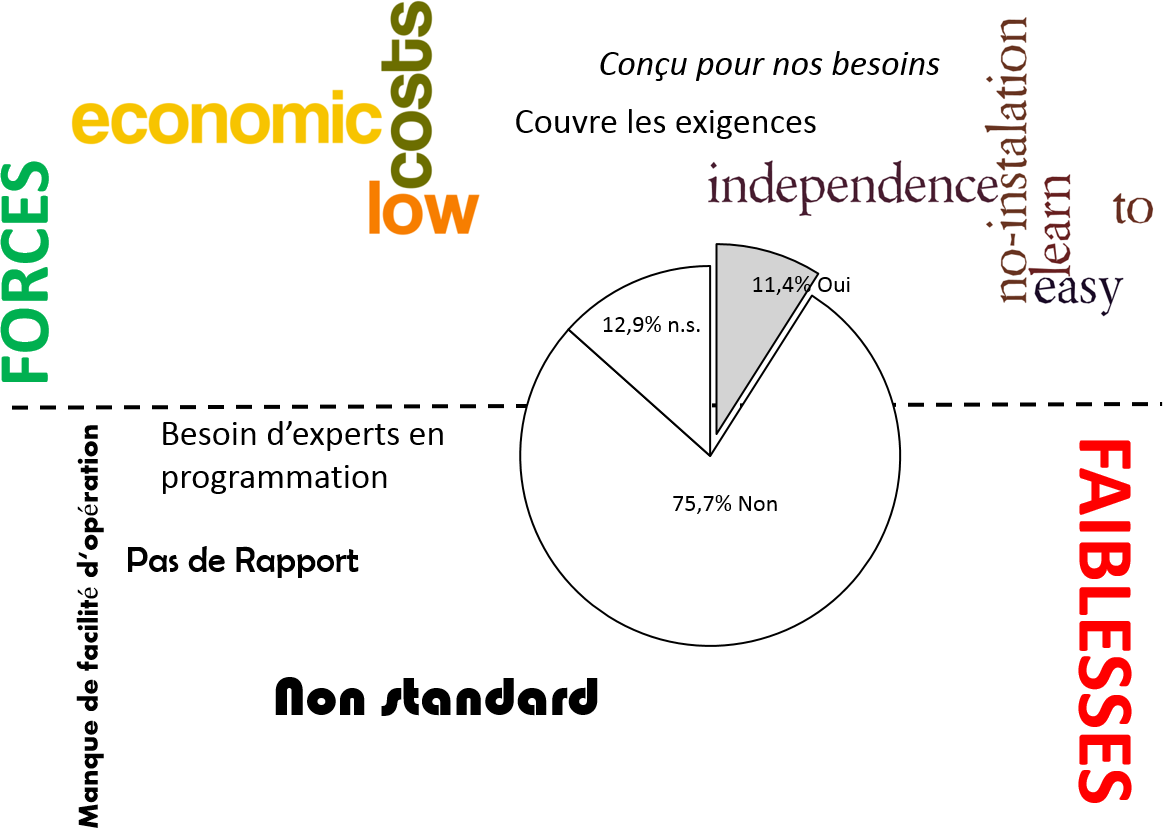 Le graphe central de la figure 4 illustre la situation actuelle en matière d’utilisation d’outils de gestion des risques. Il révèle qu’une grande majorité de PMEs ne dispose d’aucun outil dédié ou plus précisément qu’elles se reposent essentiellement sur des outils de bureautique standard tels que des tableurs. À peine plus de 10% disposent d’un outil dédié pour la gestion des risques. Les principaux freins sont le coût mais aussi l’expertise nécessaire pour arriver à maitriser ces outils. Le principal souhait ressortant de l’étude est la disponibilité d’un outil abordable, facile à apprendre et à administrer (notamment par une interface web) et ne nécessitant pas d’expertise en programmation.