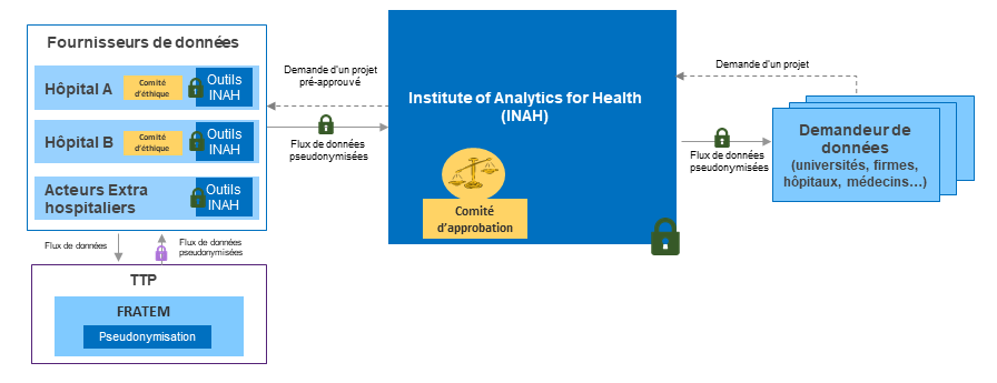 Ce projet est d’abord évalué par un comité d’approbation, qui analyse celui-ci d’un point de vue éthique et scientifique. Ensuite, le projet sera envoyé au comité d’éthique de chaque hôpital, qui pourra décider de participer à ce projet et choisir précisément quelles données seront utilisées. Ensuite, les demandeurs de données peuvent utiliser la plateforme INAH (INAH Central) : les requêtes correspondant aux besoins de l’étude sont transmises aux fournisseurs de données. Le résultat provenant des différents hôpitaux sera combiné et finalement rendu accessible au demandeur.
