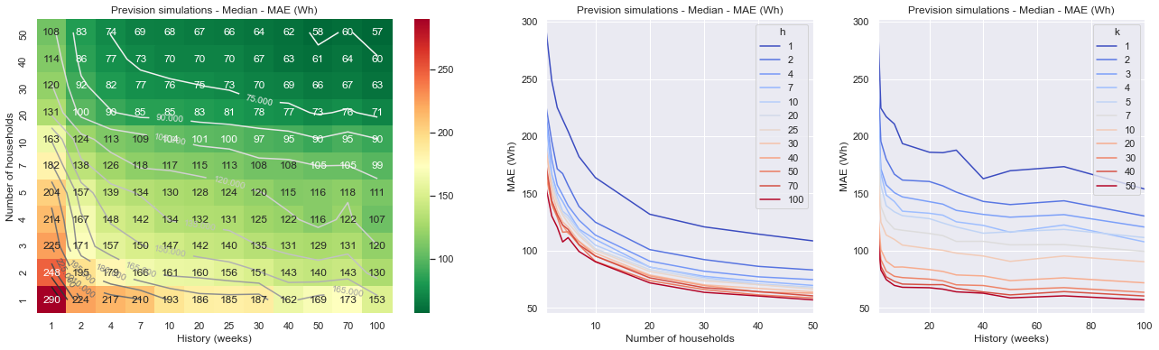 Les graphes ci-dessous synthétisent les résultats de l’analyse, indiquant les performances (MAE = erreur moyenne absolue des prévisions, en Watt*heure) que l’on peut espérer des prévisions sur une communauté, en fonction du nombre de ménages inscrits, et de la quantité de données historiques. On remarque ainsi qu’une vingtaine de foyers, ainsi qu’un historique d’environ six mois permettent d’obtenir un modèle relativement stable. La qualité du modèle peut néanmoins être améliorée davantage par l’inscription de nouveaux consommateurs, et par l’augmentation continue de l’historique de données.