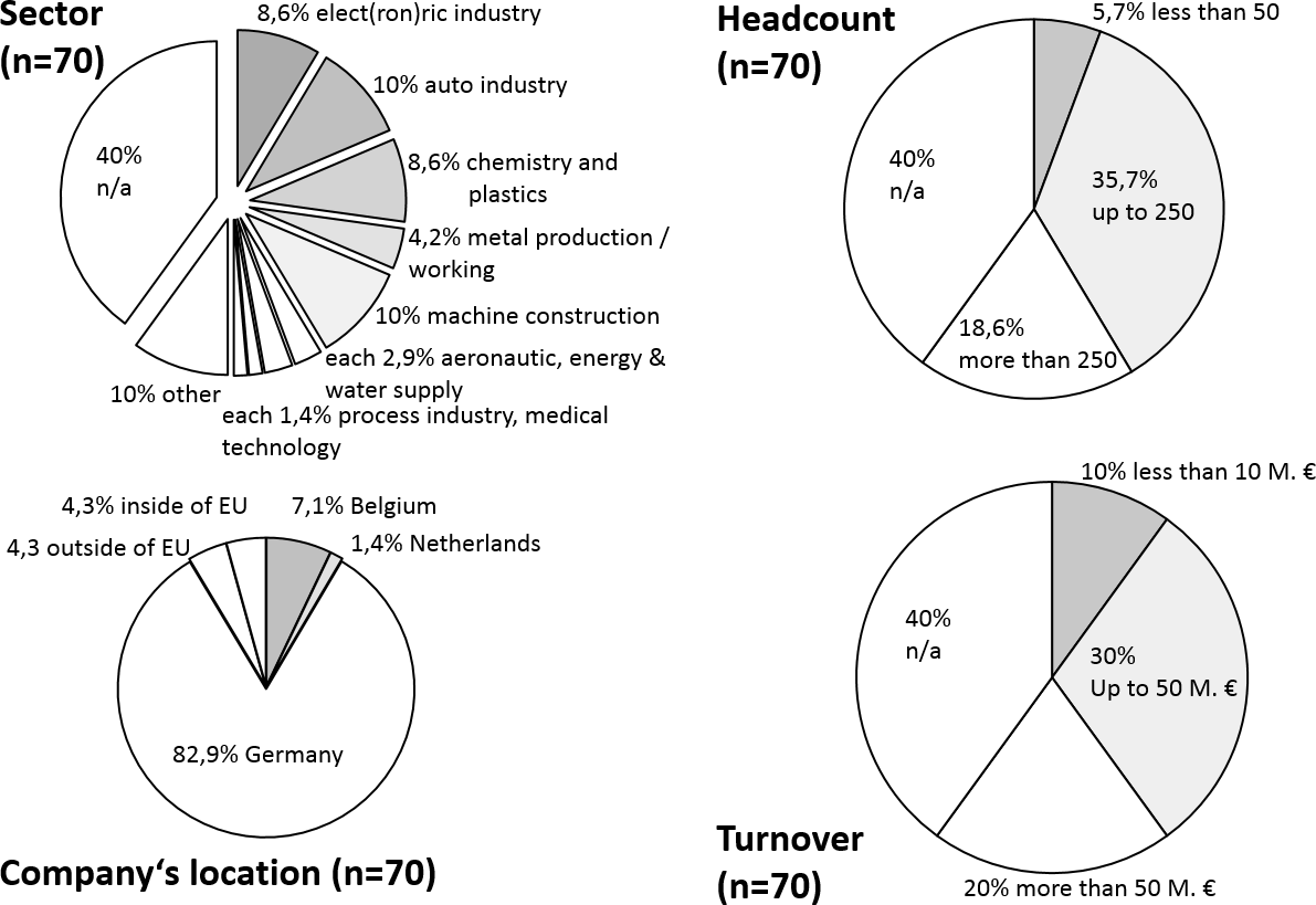 The survey was carried out from October 2014 to the end of January 2015, based on a trilingual form (French, German, English) that was distributed through different channels in Wallonia and Germany. Around 70 companies answered the enquiry which was anonymous by default, but allowed us also to record the contact data of companies interested to follow the project. The distribution of the companies was balanced between Belgium and Germany (given the sizes of activity sectors in both countries). A great variety of manufacturing industrial sectors was covered, with no predominance of any specific sector. The majority of the companies was medium-sized (between 50 and 250 employees), whereas Walloon companies were smaller, which corresponds well to their economic make-up. Nevertheless, we can notice that the Walloon manufacturing sector contains more medium-sized companies than other industrial sectors (UWE11).