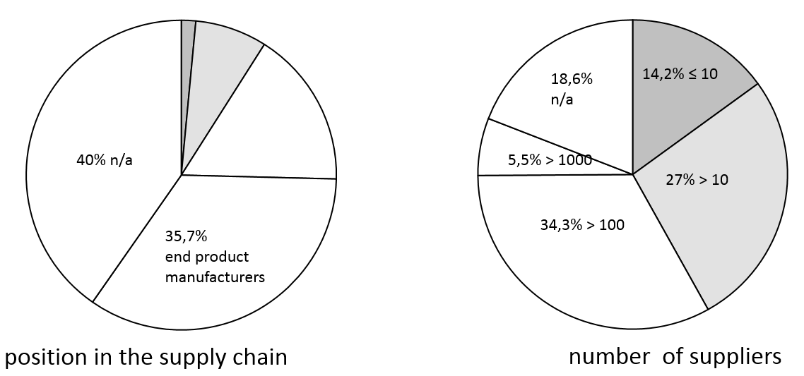 The companies that answered the enquiry were mostly manufacturers of final products, but we also got a significant number of parts assembly companies, as well as parts suppliers to a lesser extent (see figure 2). With respect to the number of suppliers for each company, we rather noticed a high number of suppliers on average: indeed there were as many companies with less than 100 suppliers, as companies having more than 100 suppliers. That number points the need of having methods and tools able to manage an important suppliers base.