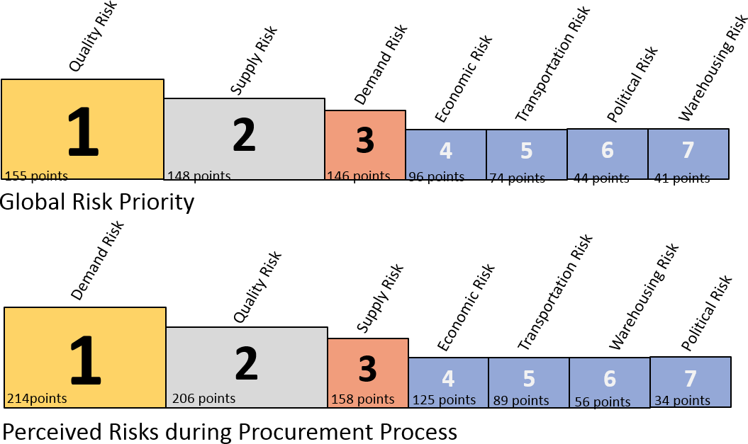 To set up a priority hierarchy for the risks to handle in a global manufacturing process (top of figure 3), we asked the companies to rank their top 3. The quality risks (products that cannot fulfil quality requirements) came first, followed by supply risks (constraints on the volume and the delays required by the clients), before the risks related to demands (which are directly related to procurement). Considering more specifically the point of view of procurement processes (that is, before the manufacturing), the bottom of figure 3 shows a similar top 3 for the risks, where the procurement risks logically ranks first. Other risks that intervene to a lesser extent are the economical risks (e.g. bankruptcy of a supplier), political risks (related to the political situation of a country or a region), transport risks (possibility of losses or delays in conveyance) and storage risks (losses or stocking degradation).