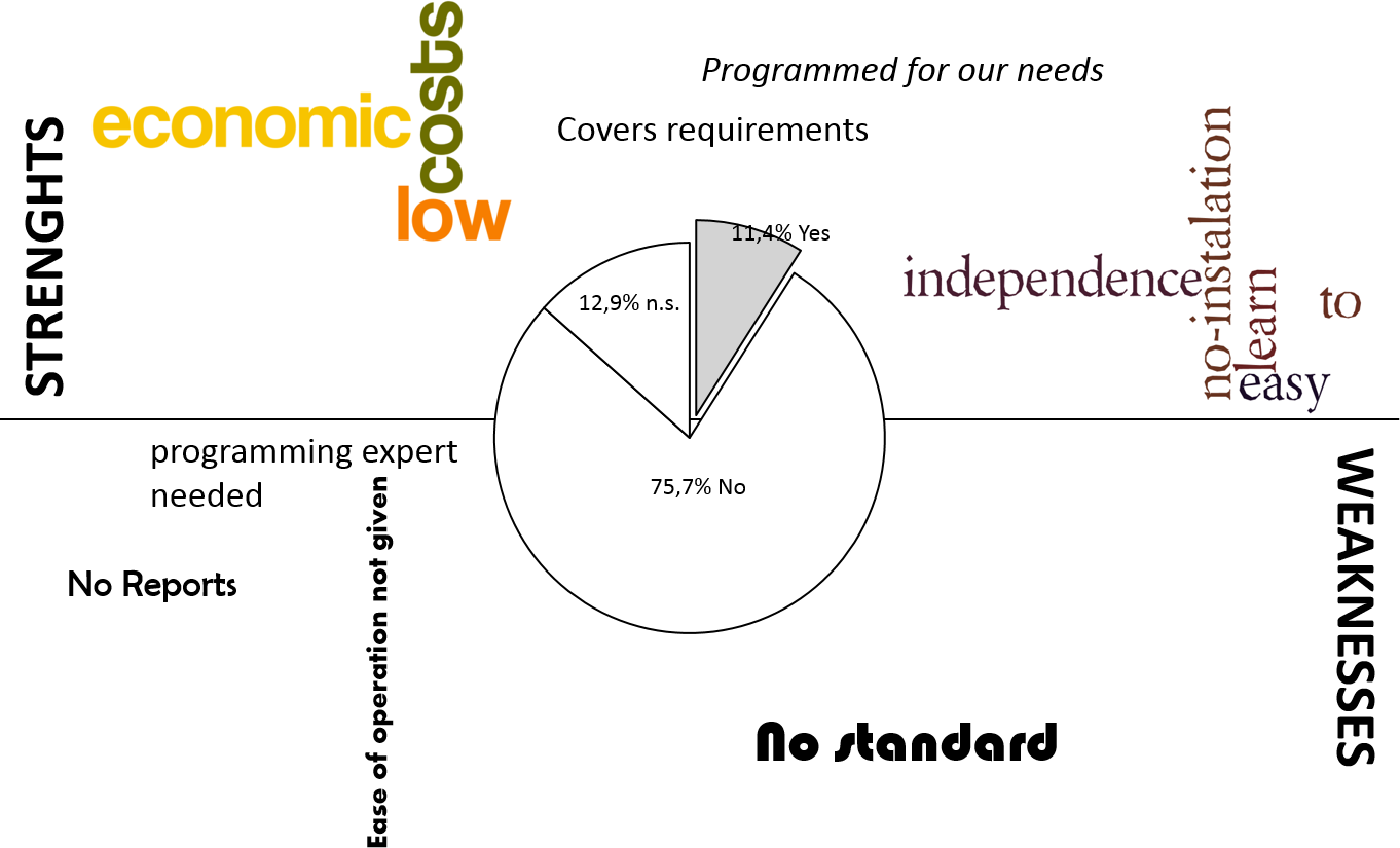 The pie chart in figure 4 shows the current situation in the use of tools for risk managing. It reveals that a majority of SMEs does not have any kind of risk management tool, or more precisely, that they rely essentially on standard office tools, like spreadsheets. Barely 10% of companies have dedicated tools for risk management. The main obstacles are the costs as well as the required level of expertise to master such tools. Our enquiry clearly highlighted that one of the main desires of SMEs would be to have at their disposal a tool that is affordable, easy to learn and administrate (mainly by a web user interface), without requiring any programming skills.