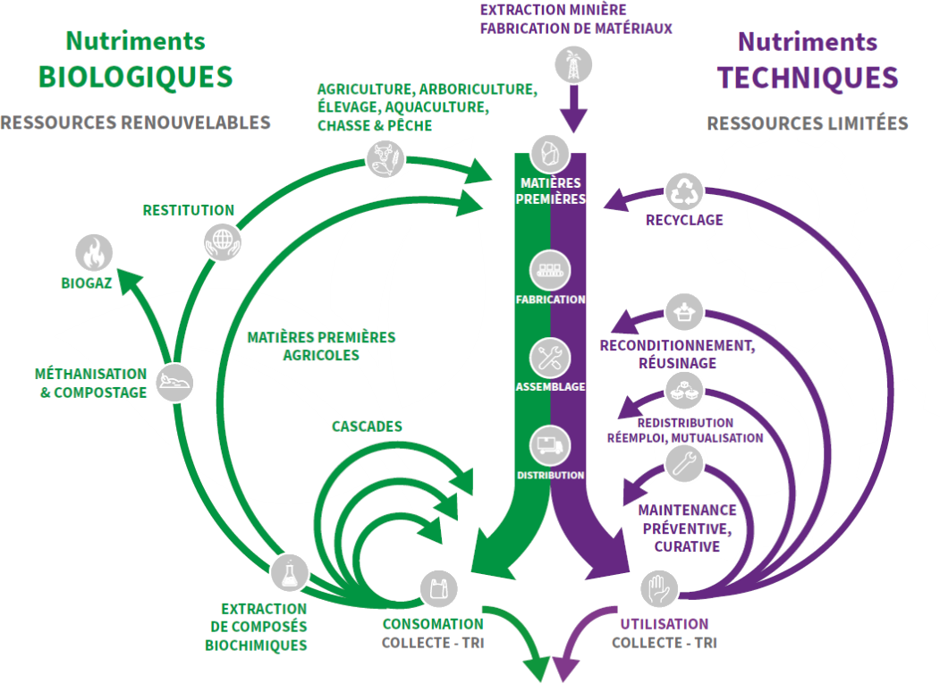 Le diagramme Butterfly (en papillon) proposé par la fondation MacArthur est illustré à la figure ci-dessous. Les cycles biologiques et techniques sont représentés respectivement à gauche et à droite avec des boucles liées à des stratégies décrites plus loin. Ainsi, au niveau technique, les boucles les plus courtes et efficaces sont du partage puis de la réparation ; les plus longues concernent le recyclage des matières premières et impliquent des coûts plus importants de collecte, tri et traitement. Elles ne sont à utiliser qu’en dernier recours car elles préservent moins la valeur du produit.