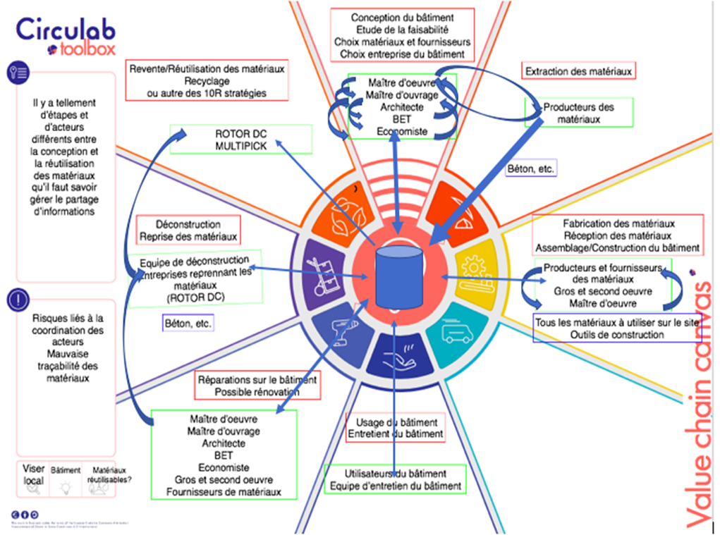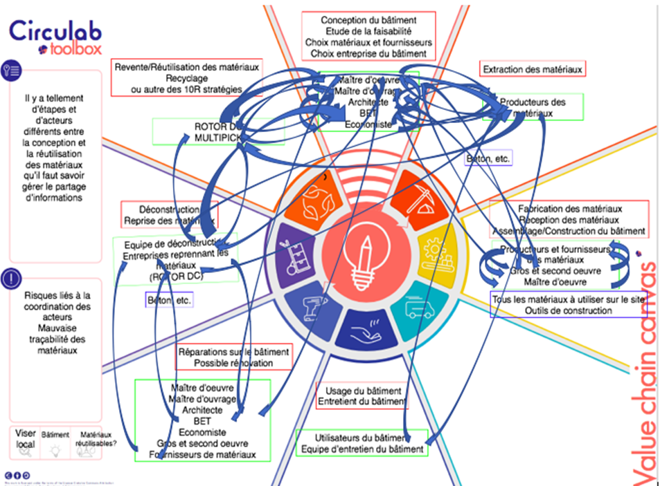 Pour mettre en place l’EC, des extensions à des outils d’analyse sont proposés, notamment un business model canvas et une chaîne de valeur circulaire développés par le CIRCULAB. Ils permettent d’identifier des possibilités de prochain usage, les flux circulaires, ainsi que les impacts positifs et négatifs au niveau sociétal ou environnemental, y compris de possibles effets de rebond.