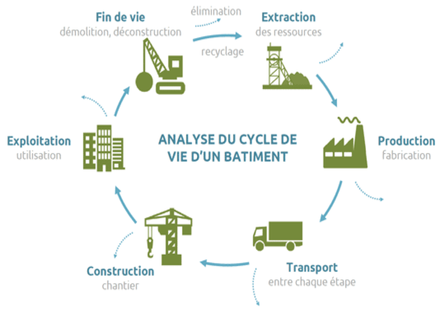 L’industrie de la construction serait responsable de plus de 30% de l’extraction des ressources naturelles et de 25% des déchets solides mondiaux. La plupart des bâtiments existants ne peuvent pas être déconstruits facilement afin d’y récupérer les matériaux qui deviennent inutilisables à la fin de vie d’un bâtiment. Au sein de l’Union Européenne, 5 à 12% des émissions de gaz à effet de serre proviennent de ce domaine, ce qui en fait un secteur à haut potentiel de réduction des émissions, estimé à 80% selon l’ARUP. Le cycle de vie typique d’un bâtiment est illustré à la figure suivante :
