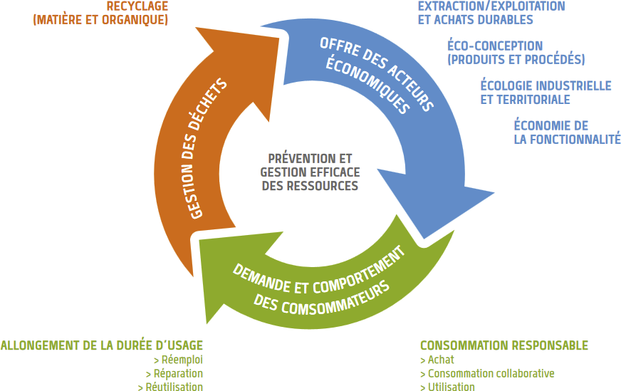 Diverses stratégies de maintien/remise en circulation alimentent l’EC, notamment les stratégies en R, avec notamment des approches de Réduction pour limiter la quantité de ressources nécessaires à la fabrication ; de Réutilisation pendant la vie du produit pour la prolonger au maximum en réutilisant ou en réparant, ou encore de Recyclage, en fin de vie du produit. Ce concept peut s’étendre et se décliner sous d’autres formes notamment ReSOLVE (Régénérer, Partager, Optimiser, Boucler, Visualiser et Échanger).