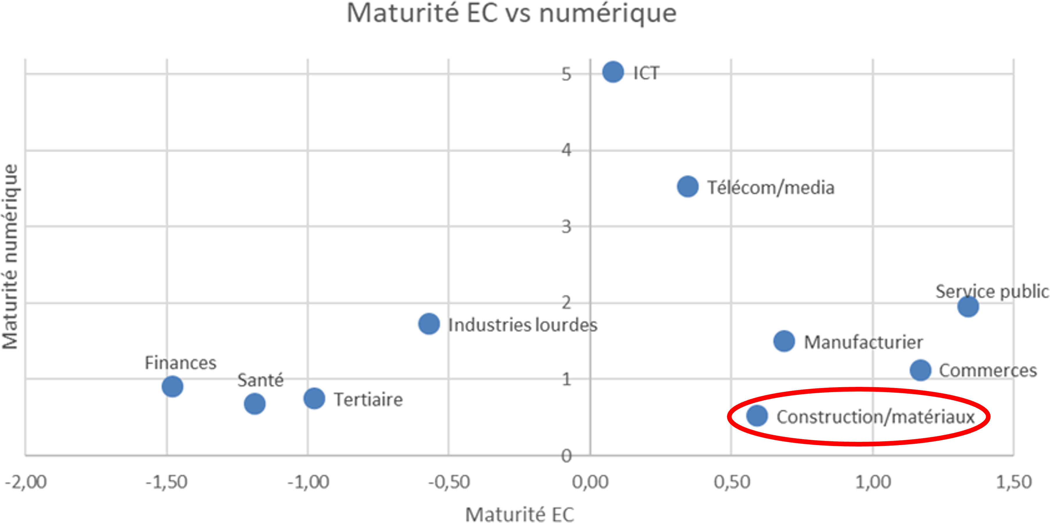 Etape 1 - Situer la maturité tant au niveau circulaire que numérique peut s’appuyer sur des indicateurs publiés. Dans notre cas, nous avons combiné la maturité numérique fournie par le baromètre digital wallon et de maturité de l’économie circulaire selon l’index CEBIX (Circular Economy Business IndeX (Circular Economy Business IndeX). Il combine 17 indicateurs couvrant des dimensions d’efficacité des processus, de réduction des émissions, de mise en œuvre de boucles, de gestion des déchets, de recherche/innovation. Les deux indicateurs sélectionnés nous ont permis de situer la maturité du secteur de la construction, comme l’illustre la figure suivante. On remarque que la maturité numérique y est assez faible mais qu’une réelle conscience est présente au niveau du besoin de circularité. Ce secteur est donc une cible très intéressante en termes de potentiel d’amélioration.