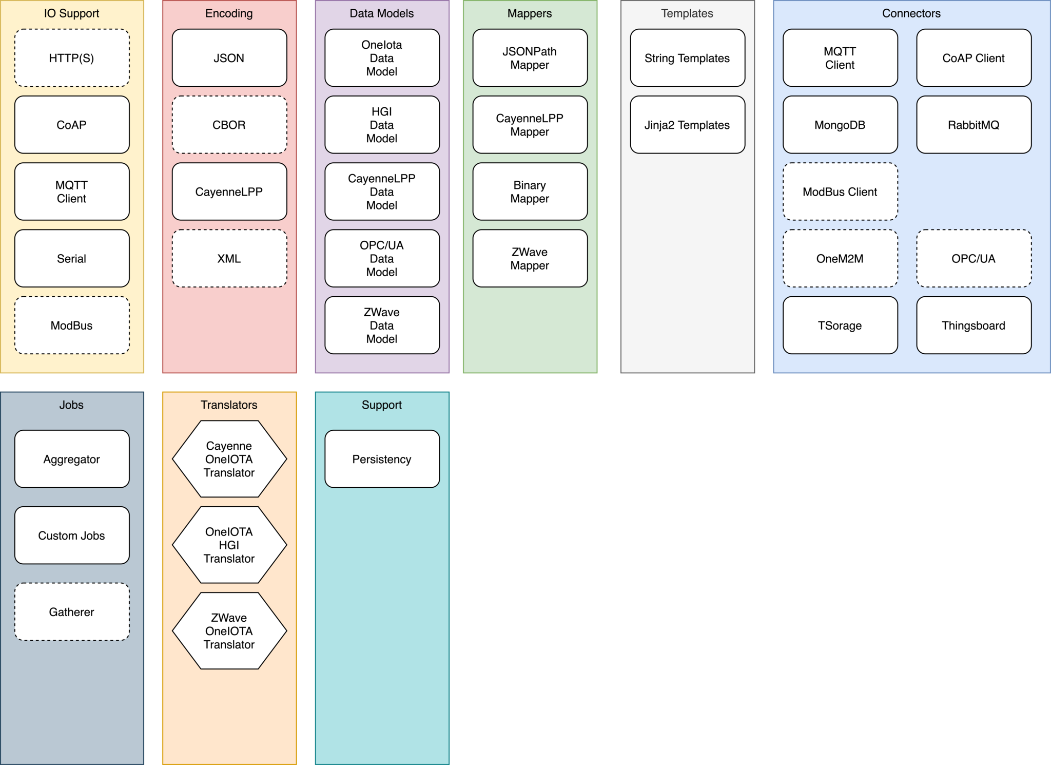 In the MARINA (ModulAR INdoor Air quality management platform towards energy efficient systems and healthy places) project, CETIC provides expertise in the advanced and transparent management of the heterogeneity of the sensors involved and the data they generate (see Figure 1). CETIC is developing an IoT middleware, DMWAY (Dynamic Mapping Gateway), allowing efficient management of IoT data streams from/to heterogeneous data sources, interfaces and protocols. DMWay is a modular, extensible and configurable middleware, based on a flexible architecture leveraging a toolbox of specialised software modules (see Figure 2).