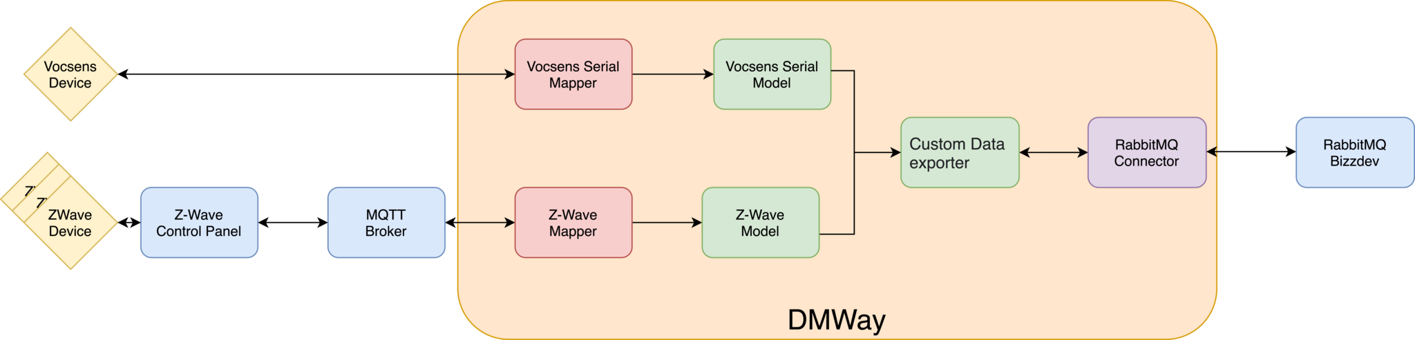 The objective of this PoC is to evaluate DMWAY in the BizzDev partner’s environment. The PoC is represented in the figure below, it allows the collection of data from connected sockets and multi-sensors deployed in the premises of BizzDev, and from a remote ammonia - NH3 sensor(developed by the VOCSens partner for this example) deployed in CETIC premises. The latter sends the measurements remotely to the BizzDev infrastructure using the RabbitMQ connector. Thus, this PoC illustrates DMWay’s ability to manage various distributed data sources, and to connect effectively and simultaneously to the processing and visualisation services in different locations (Gosselies and Tournai in this example).