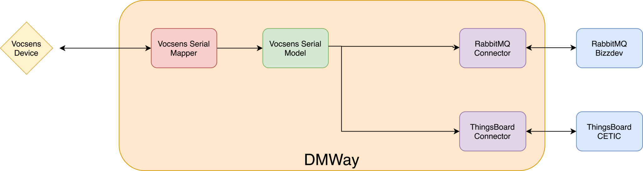 The objective of this PoC is to implement the specific interface allowing the VOCSens sensor’s proprietary data collection support. This sensor communicates through a serial link. It is connected to a RaspberryPi on which a DMWay instance is deployed. A Mapper is implemented to translate the data received from the sensor in JSON format into an associated data-model representation for it inside DMWay. This work has to be done only once. Hence, the integration of new sensors with the same characteristics is greatly facilitated thereafter since it can leverage the same data modeling henceforth supported :