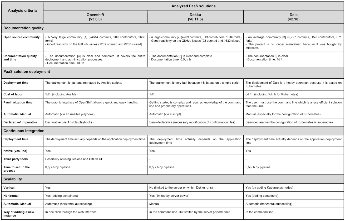 Based on the table above and our findings made during the installation and testing of PaaS solutions, we present a synthesis for this blog post: