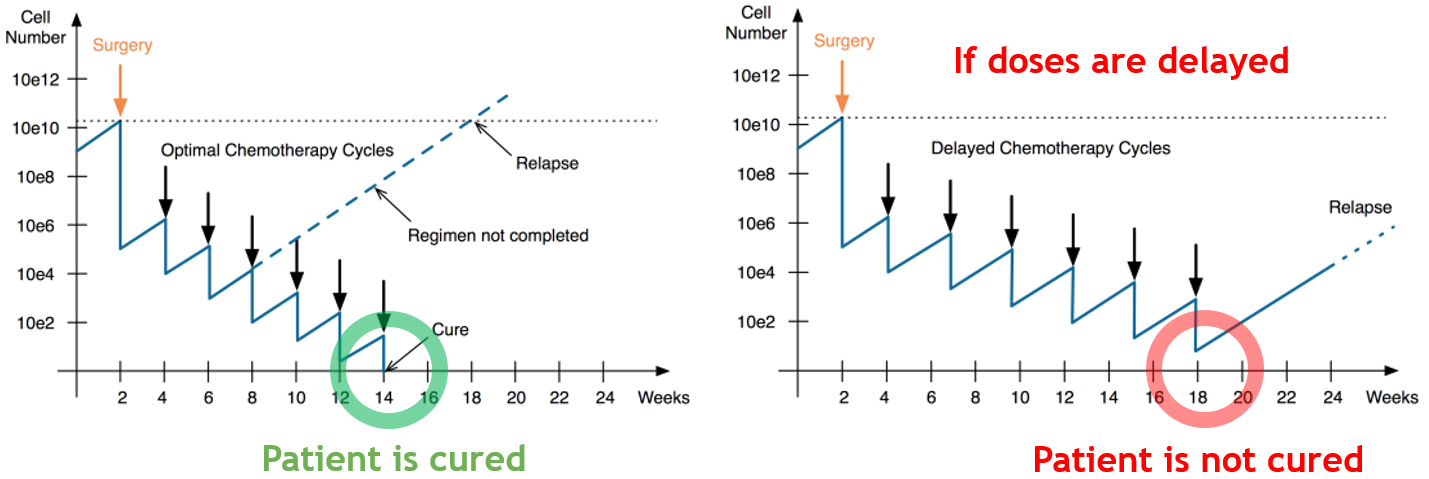 In our research, initiated under the PIPAS project PIPAS, we have focused our effort on the scheduling of chemotherapy pathways in oncology. Chemotherapy drugs must be delivered in several doses. To be efficient, dose deliveries must be kept within close timing. On the other hand, a minimal delay must be observed between dose deliveries to avoid damaging the patient’s health further, because of the toxicity of such treatments. If dose deliveries are spaced too widely, or if a dose is not delivered, cancer cells get an opportunity of growing again (see figure 1).