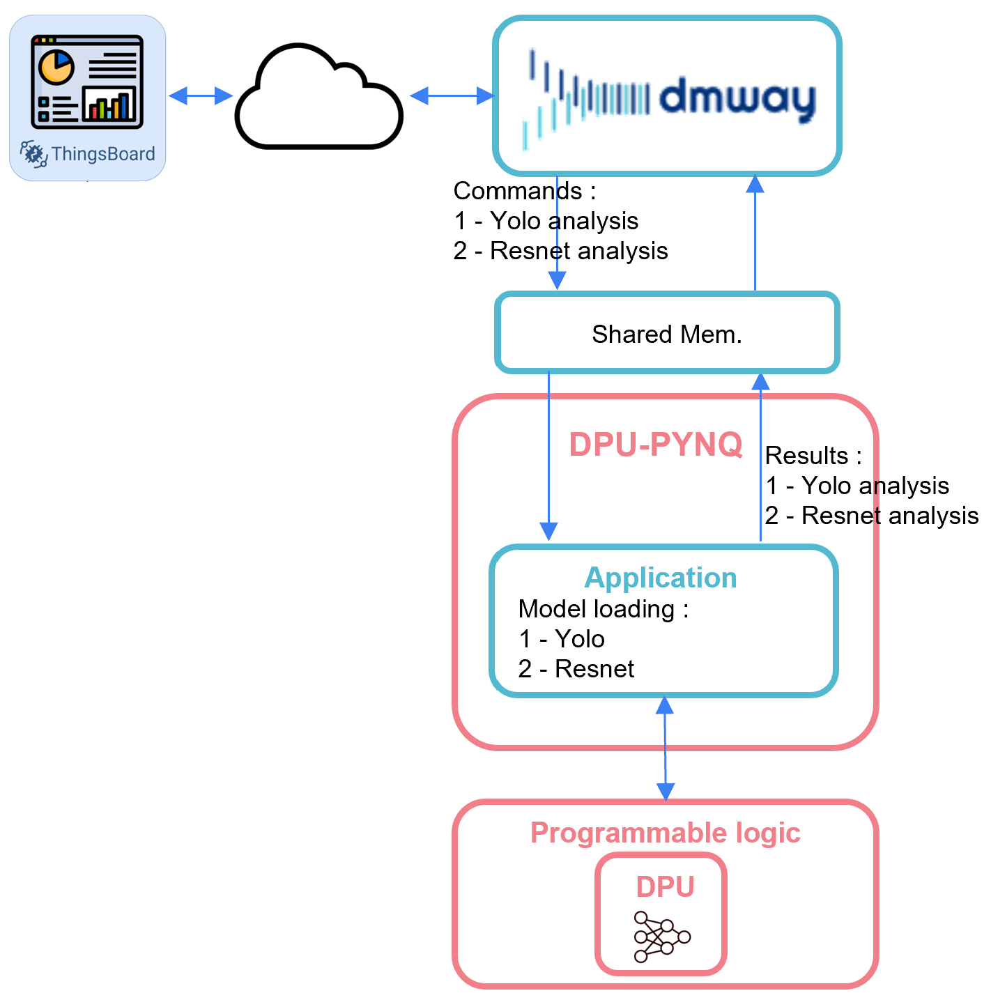 The software architecture is built upon two primary components. On one side is DMWay, responsible for orchestrating the execution of the different steps within the control sequence. On the other side is a dedicated application designed to activate the AI model according to these steps. Thus, DMWay sends commands to the application, according to results provided by neural networks and instructions received from the dashboard. These two software components are executed within separate processes, communicating through a common shared memory mechanism.