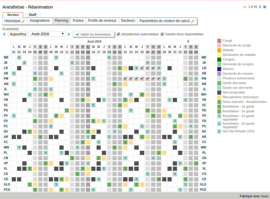 La génération automatique de planning nécessite de prendre en compte différentes contraintes complexes telles le travail à temps partiel, les absences, les repos compensatoire, vacances, etc. Pour maximiser l’acceptation par les utilisateurs, la solution doit également permettre aux médecins d’exprimer des préférences, d’échanger des rôles et doit également procurer un sentiment d’équité entre médecins.