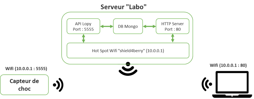 Les tests réalisés en laboratoire ont donné de bons résultats sur la réactivité, la consommation et la praticité du système complet, logiciel embarqué et matériel. Pour les tests, un serveur recevant les échantillons du capteur par Wifi, permet à l’utilisateur de visualiser le signal reconstitué. Le banc ci-dessous a été utilisé pour la caractérisation du signal de choc et la mise au point du logiciel embarqué dans le capteur.
