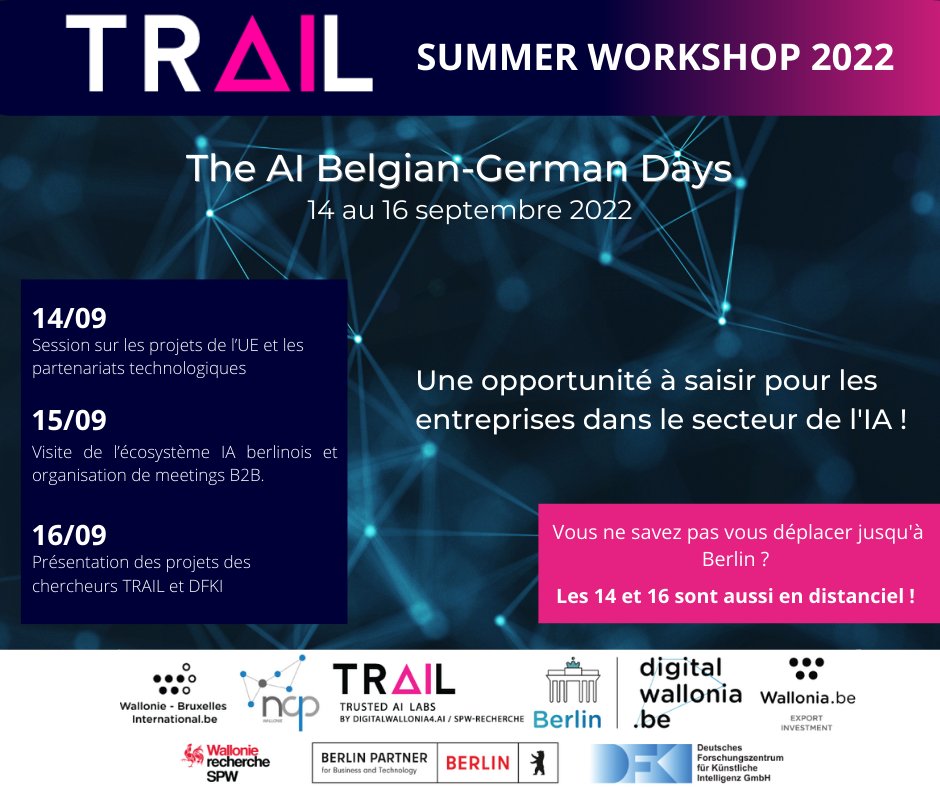 Dans le cadre de cette édition 2022 du Summer Workshop, outre les travaux de recherche menés par TRAIL, DFKI et Berlin Partner, plusieurs évènements sont planifiés en collaboration avec WBI, l’AWEX et le NCP.