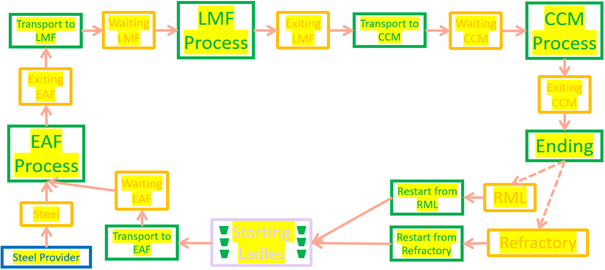 A simulation engine that uses data directly from the plant and is developed by defining the ladle logistics in the steel plant as a Discrete-Event model. The simulation of the Discrete-Event model allows the computation of many quantitative metrics on the ladles and processes that are required to be scheduled in a more dynamic way.