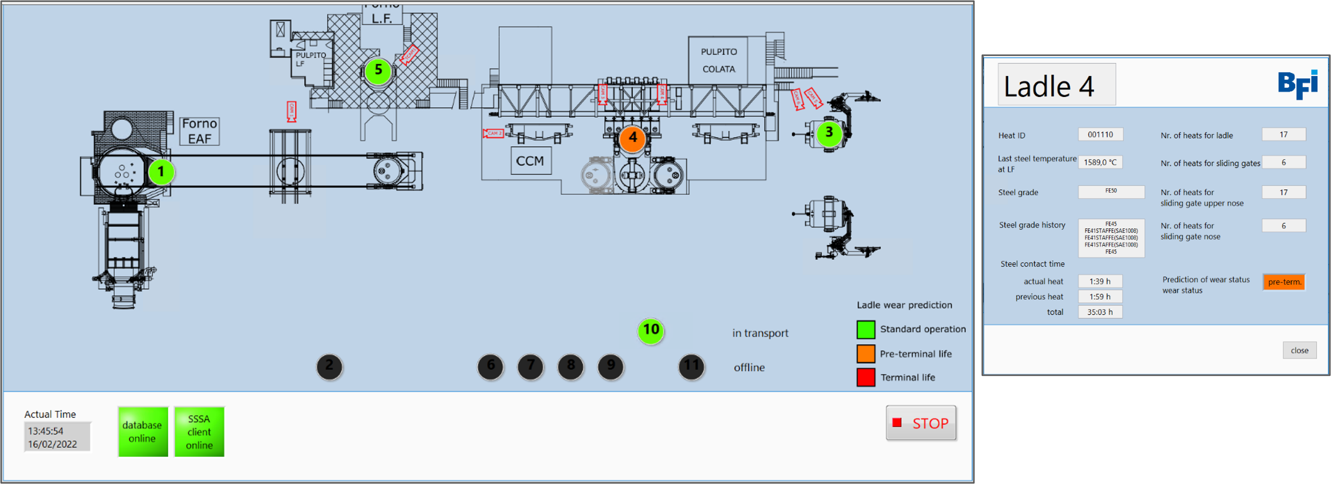A system for the online assessment of the ageing status of the ladles operating on the FENO plant has been designed by SSSA and implemented in the project framework. The system exploits data analysis and AI-based technologies to estimate in advance the need of maintenance operations on the above-mentioned ladles by exploiting different sources information among which the operation history of ladles (including process conditions) and the reading of the thermo-cameras installed on the plant within the project.