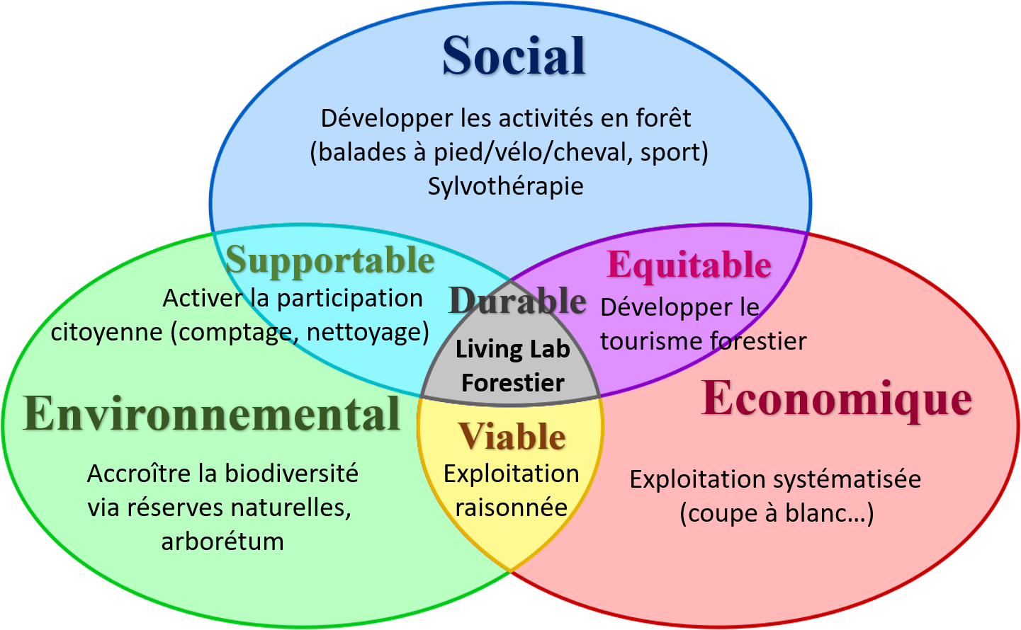 Notre laboratoire vivant est ancré dans la forêt de la Grande Région, couvrant 2375 000 ha dans quatre pays (Luxembourg, Belgique, France et Allemagne). Une grande partie (plus de 40%) de cette forêt est propriété privée et mal entretenue, retournant ainsi à l’état sauvage avec des impacts positifs (biodiversité) et négatifs (propagation de maladies, risque d’incendie). La biodiversité est également affectée par les monocultures d’espèces non endémiques comme l’épicéa qui dominent certaines parties de la forêt. Pour relever ces défis, le living lab a exploré toutes les dimensions de la durabilité, c’est-à-dire environnementale, sociale et économique, avec différentes parties prenantes et à travers deux projets complémentaires : Agreta (axé sur le tourisme) et RegioWoodII (axé sur la surveillance des forêts et leur gestion). Les scénarios et activités clés illustrant ces dimensions sont illustrés à la figure 1 ci-dessous.