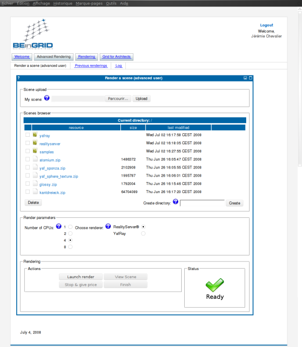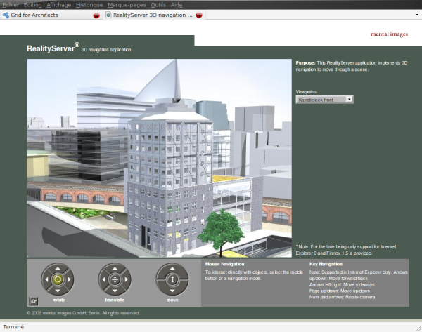 L’expertise du CETIC dans les domaines de l’ingénierie des exigences, des middlewares Grid (Globus), des portails applicatifs (Gridsphere) et de la sécurité, a permis à ses chercheurs de relever, à l’aide de ses partenaires, les différents défis posés par « Virtual Reality for Architects ». Tout d’abord, une analyse des besoins des utilisateurs finaux, c’est-à-dire les architectes, a dû être conduite. Ensuite, une étude portant sur les solutions de rendu 3D fournies par mental images® a été menée. Parmi ces dernières, le moteur de rendu 3D en temps réel, RealityServer®, se démarqua. Celui-ci permet de naviguer interactivement dans une scène en trois dimensions, ses calculs étant distribués sur une ou plusieurs ressources informatiques centralisées dans un même réseau local. La deuxième solution sélectionnée, mental ray®, effectue plus conventionnellement un rendu sur image fixe. Pour permettre à ces applications de s’exécuter de façon optimisée sur plusieurs ressources distinctes et géographiquement distribuées, des efforts ont dû être fournis afin d’intégrer ces moteurs 3D dans une application Grid. Un portail Web a ensuite été développé, permettant aux utilisateurs de soumettre aisément leur scène tout en spécifiant les paramètres d’exécution. En cliquant simplement sur un bouton, après avoir choisi le mode de rendu adéquat (temps réel ou fixe), l’application affiche à l’écran le résultat du traitement, sans contrainte matérielle ou logicielle particulière. A la fin du rendu, l’utilisateur est informé du coût qui lui sera facturé, sur une base de tarif par Gigahertz et par heure. Derrière cette apparente simplicité se cache bon nombre de mécanismes ayant été développés pour les besoins de l’application.
