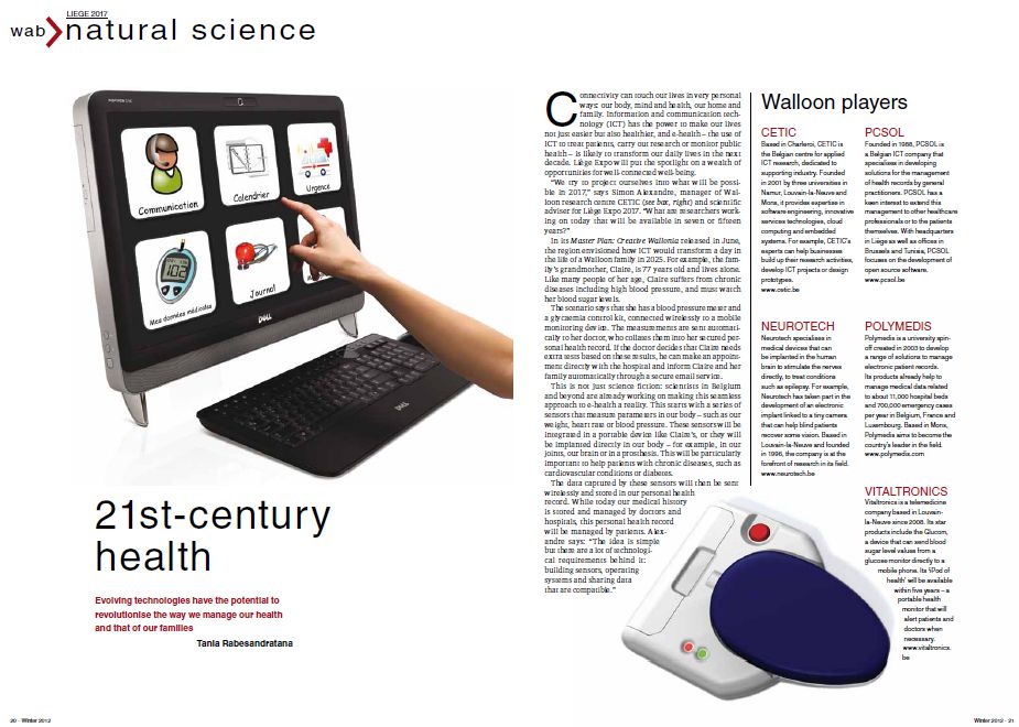 L’édition "Hiver 2012" du Wallonia and Brussels Magazine (WAB) couvre la candidature de la Ville de Liège à l’exposition internationale de 2017 (Expo Liège 2017). Simon ALEXANDRE, Directeur du CETIC, y positionne notre expertise en matière d’eSanté dans un article intitulé "21st-century health".