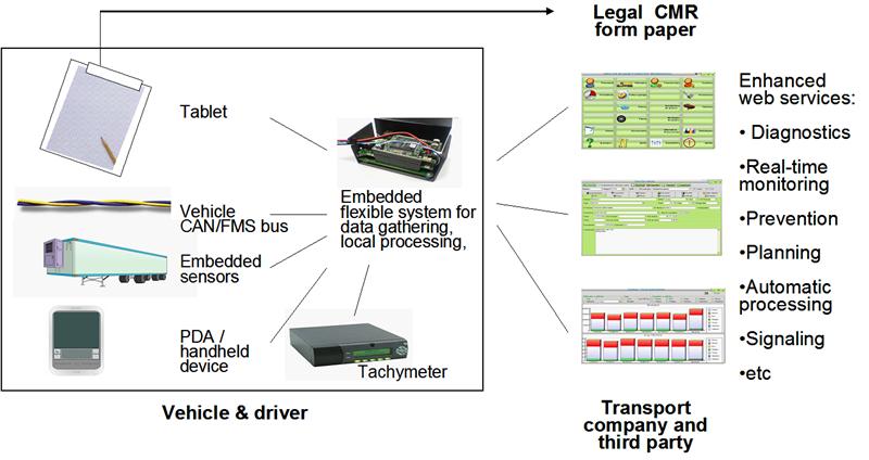 Le projet eCMR concerne l’exploitation des données de CMR (Formulaire ou Lettre de voiture défini et règlementé par la Convention relative au contrat de transport international de Marchandise par Route) papiers numérisés en association avec d’autres sources d’informations dans les véhicules (capteurs, CAN BUS, GPS et autres) à des fins d’optimisation gestion de flottes par le développement de nouveaux services à forte valeur ajoutée.