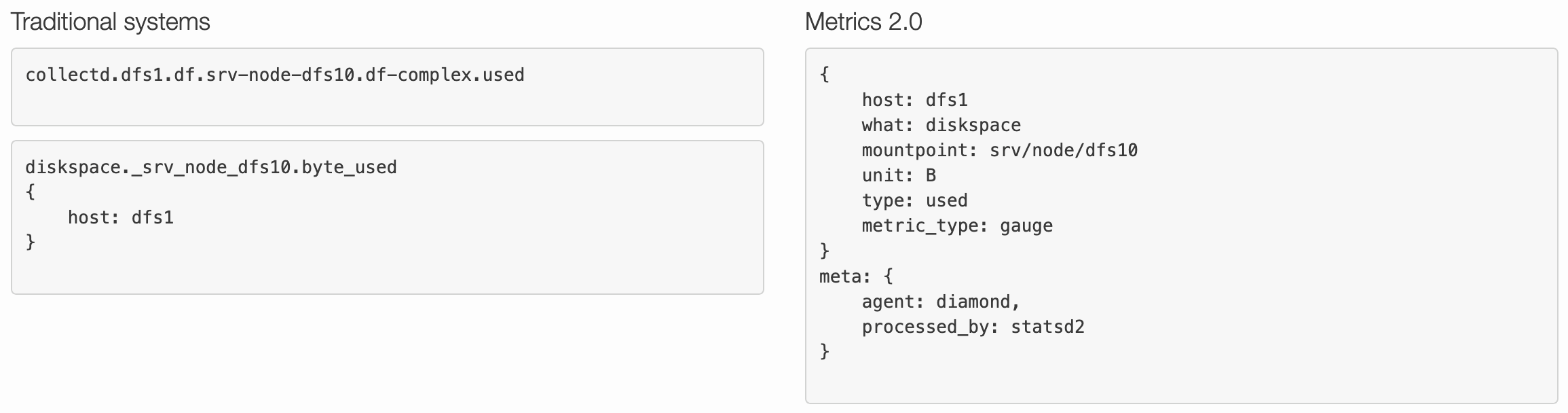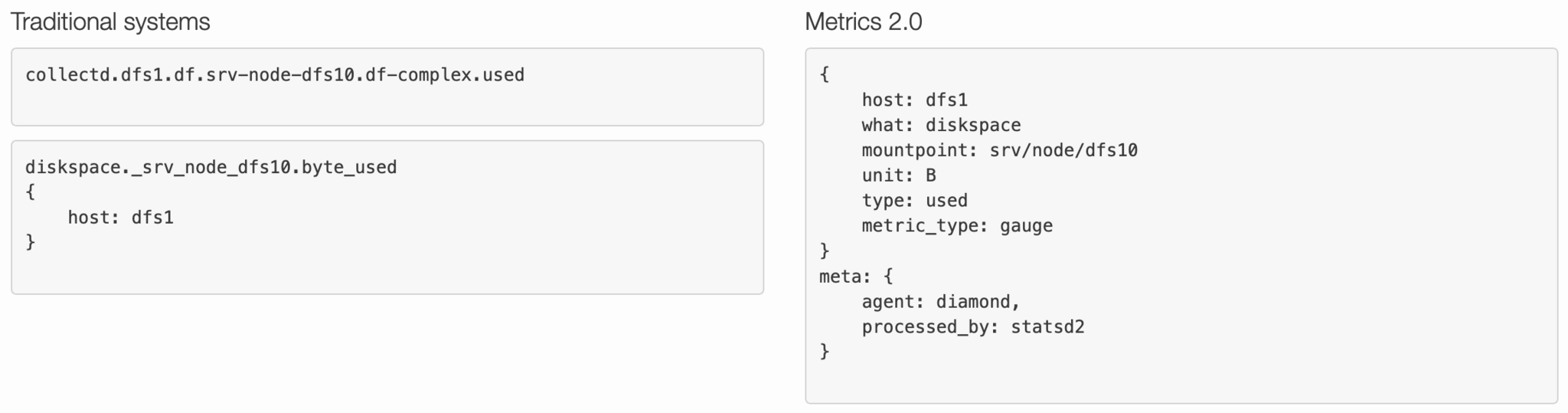 Metrics 2.0 est un ensemble de conventions, de standards et de concepts qui proposent une telle approche. Au cœur de sa proposition, on trouve l’idée qu’à chaque observation doit être associé un ensemble de paires clef-valeur qui caractérisent l’observation. Collectivement, ces paires, parfois aussi appelées tags, constituent les métadonnées d’une observation.