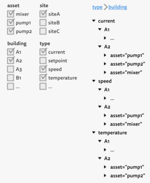 Dans les outils traditionnels, les capteurs sont organisés de manière hiérarchique, selon une organisation déterminée à l’avance. Le plus souvent, la nomenclature des capteurs tente de correspondre à cette organisation. Sur le terrain, les utilisateurs doivent donc naviguer dans un arbre dont la structure est rigide, et donc plus ou moins adaptée et pertinente en fonction du contexte d’utilisation. En particulier, toute manipulation de capteurs placés sur des branches éloignées les unes des autres s’avère laborieuse.